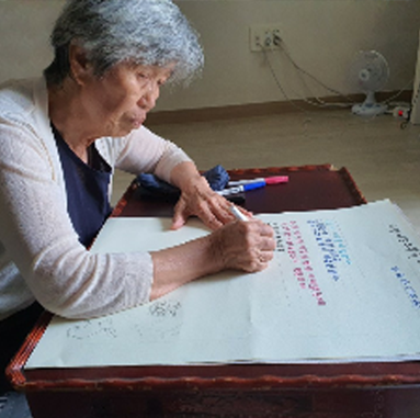 지난 7월 충북도평생교육진흥원 주관 ‘2020 전국 성인 문해시화전'이 열렸다. 시화전의 주제는 코로나19로 인해 힘든 시간을 보내고 있는 우리 주변에 용기와 희망을 전하는 위로와 응원의 메시지였다. 장금자 어르신의 시화는 코로나로 인해 외출이 어려워지자 남편과 집안에서 투닥거리며 함께한 덕분에 평생 느껴온 원망감은 사라지고 정이 깊어져 의지가 된다는 내용을 표현했다. 일상을 '두부국'과 '싸움국'으로 담아낸 표현의 독창성과 참신성이 좋은 평가를 받았다고 전해왔다.