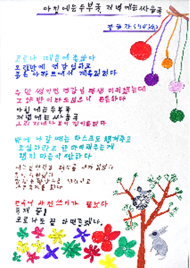 “코로나 때문에 좋았다... (중략) 속만 썩이던 영감님 평생 미워했는데... 아침에는 두부국, 저녁에는 싸움국 그리 지내다 보니 정이 들었다.” 증평군 장금자 어르신의 ‘아침에는 두부국, 저녁에는 싸움국’ 작품 속 글귀이다.