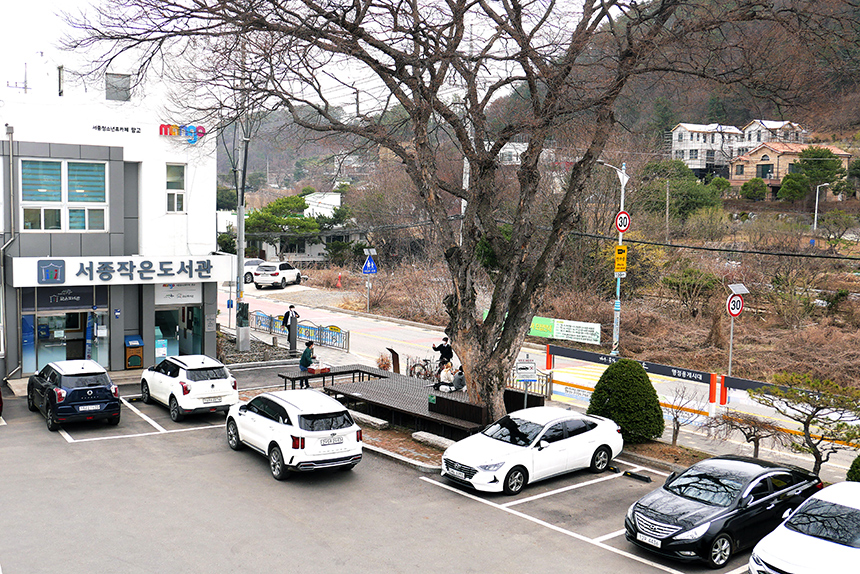 벽화 옆 아름드리 나무 아래는 크지도 작지도 않은 쉼터가 조성되어 있다. 차량 3대 정도 주차 공간을 새롭게 바꾼 공간이다. 주민센터 민원인들이 잠시 땀을 식히고 서류를 검토하기도, 작은도서관에서 책을 보던 아이들이 삼삼오오 모여 깔깔대기도 하는 장소다. 근처 초등학교 아이들이 붙여준 ‘한뼘공원’이란 별명은 이제 정식 명칭이 되었다. 조성에는 서종면사무소, 주민자치위원회, 작은 도서관 청년회가 함께 했다. 10여차례 회의로 위치와 형태, 디자인, 조립, 청소 등 매 과정에 주민참여가 함께했다. 주차공간 축소에 대한 우려와 반대도 있었지만 함께였기에 가능한 변화였다.