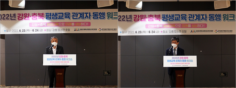 이번 워크숍을 공동 주최한 손인주 강원인재육성평생교육진흥원장(좌)과 정초시 충청북도평생교육진흥원장(우)