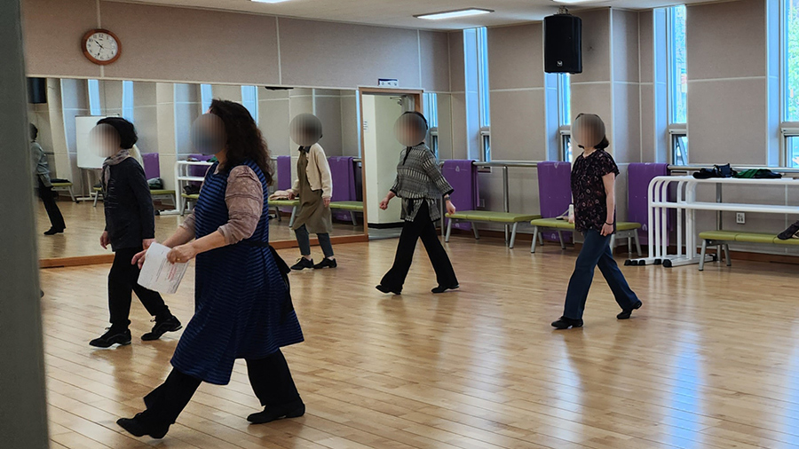 가장 먼저 방문한 곳은 바로 ‘댄스실’이었는데요. 댄스실에서는 ‘라인댄스 강의’가 한창이었습니다. 수강생 분들이 열심히 강사님의 박자에 맞춰 춤을 추는 모습이 굉장히 즐거워 보이셨습니다.