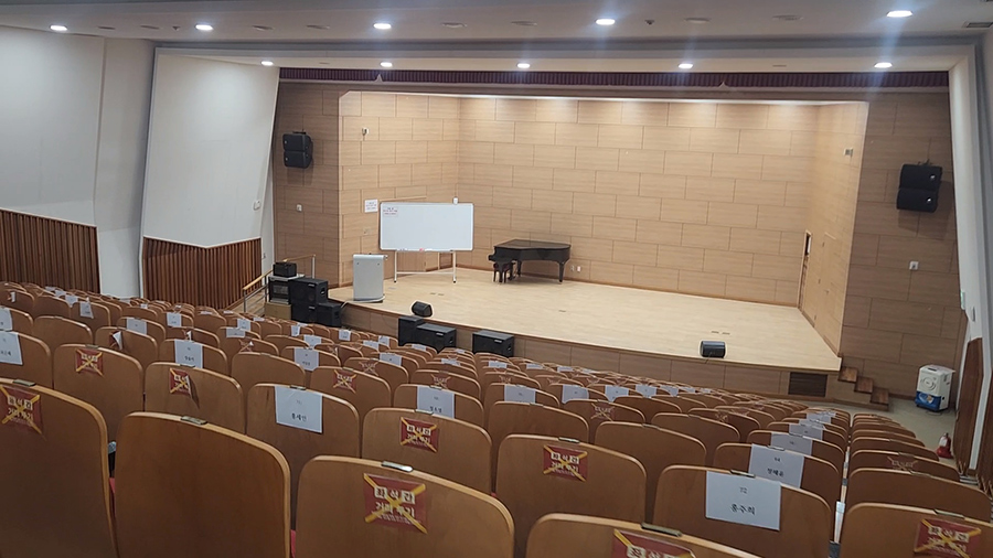 이곳은 보육교직원 보수교육이 주로 이루어지는 충북대학교 평생교육원의 대강당입니다. 음향학적으로 설계된 이 공간은, 별도의 마이크 없이도 소리가 뒷자리까지 울려 퍼진다고 합니다. 악기를 다루는 평생교육 강의에서는 이 대강당을 이용하여 수강생 분들의 가족을 초대하여 공연을 진행하기도 합니다. 모든 강의가 진행되는 것은 아니고, 희망자에 한하여 공간을 사용할 수 있도록 도와주신다고 하셨습니다. 평생 교육을 통해 익힌 악기를 실제로 가족에게 공연으로 보여줄 수 있다면 더욱 보람 있을 것 같습니다.