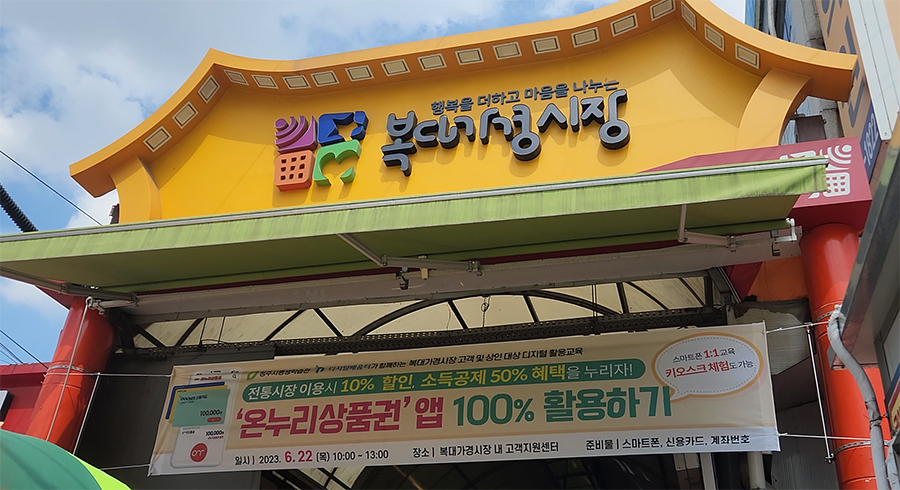 6월 22일에는 복대가경시장에서 ‘디지털배움터’ 사업과 연계하여 스마트폰 활용에 어려움이 있는 상인분들에게 온누리상품권앱 설치 및 사용방법, 매출관리 방법 등을 알리는 시간을 가졌다.