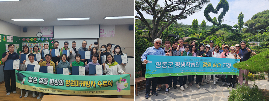 영동군 평생학습관은 청정한 자연환경과 정원 활성화를 위한 전문적인 교육을 통하여 지역 정원 전문 인력 양성으로 일자리 창출 및 정원관광 활성화를 위해 정원마케팅사 양성과정을 추진한다. 이론과정은 지난 4월과 5월 동안 이루어졌으며, 실습과정은 6월부터 진행된다. 영동군 평생학습관 및 국내 정원을 중심으로 실습이 이루어질 예정이며 영동군민 20명을 대상으로 진행된다. 이 프로그램을 통해 국민에게 전문교육 기회를 제공하여 기술력을 가진 공공 정원 분야 전문가(정원 마케팅사 2급 자격증)를 양성한다.